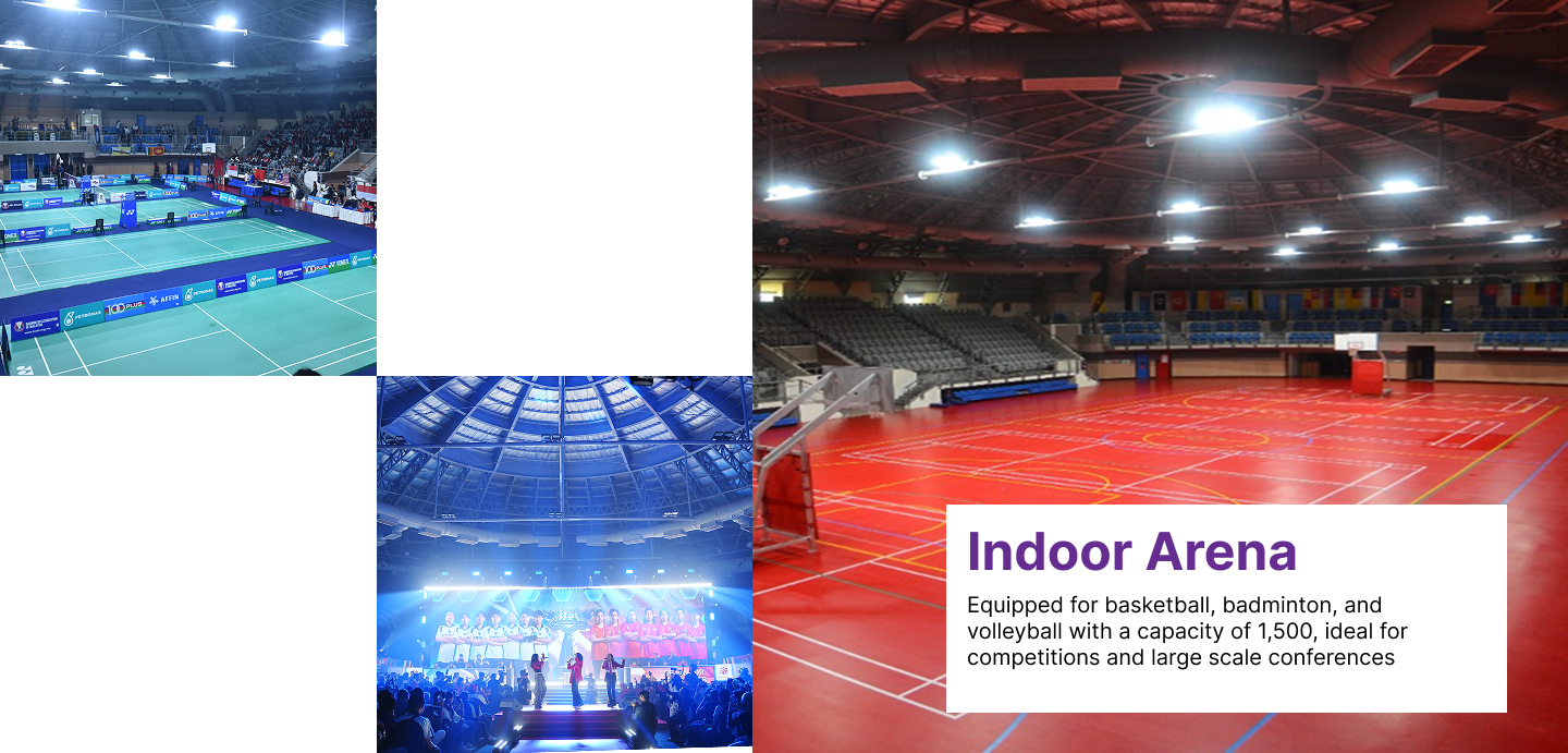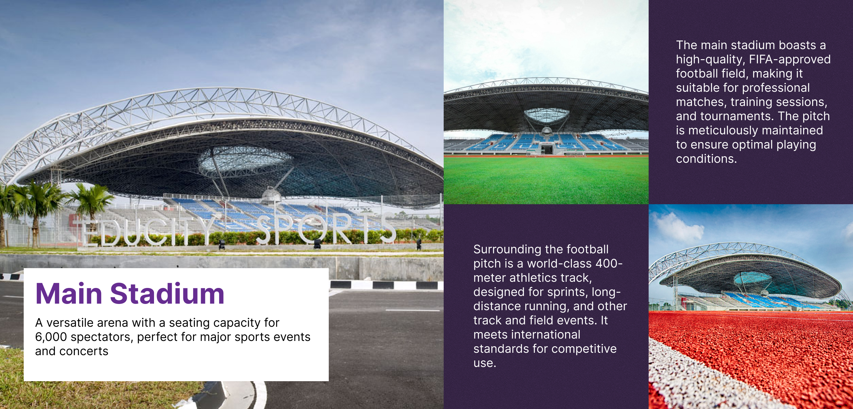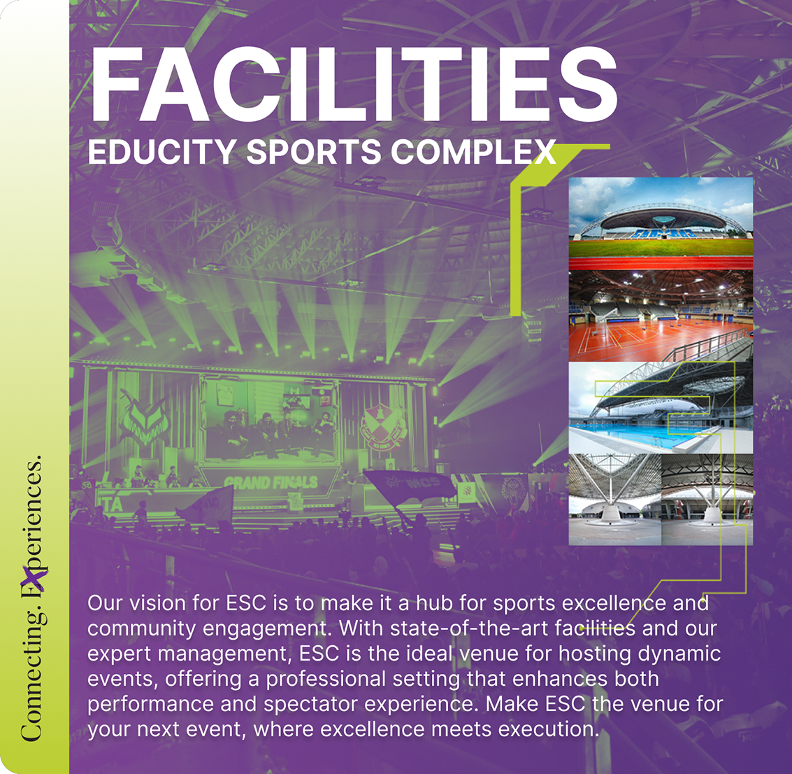ESC offers world-class sports facilities, including a FIFA-standard football pitch, Olympic-sized swimming pool, athletics track, and multi-purpose outdoor courts for futsal, netball, and volleyball. Its versatile indoor arena supports badminton, basketball, and more, with spectator seating and top-tier amenities. Perfect for training, competitions, and recreation, the complex is a hub for athletes and the community.